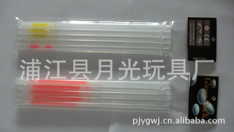 月光玩具廠位于浙江浦江縣, 我廠生產的熒光棒是國際上流行的新型光源,它不需要電源,由化學能直接轉化為光能,具有各種規格:手鐲5MMX200MM、6X200MM。項圈5MMX580MM、6MMX580MM。主要產品有發光大棒、發光手鐲、發光項圈、4英寸、6英寸發光棒。顏色具全,有紅、橙、藍、黃、綠、紫等多種顏色,可持續發光5-24小時不等,質量穩定可靠,保質期長達兩年以上。