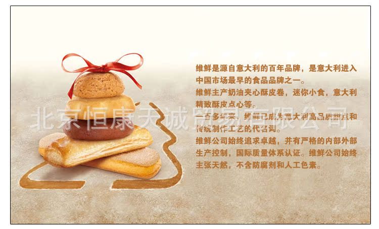 維鮮,意大利百年品牌,源自1905年,是意大利進入中國市場早的食品品牌之一。主產奶油夾心酥皮卷,迷你小食,意大利精致酥皮點心等。一百多年來,Vicenzi已成為意大利高品質甜點及意大利傳統甜點制作工藝的代名詞。