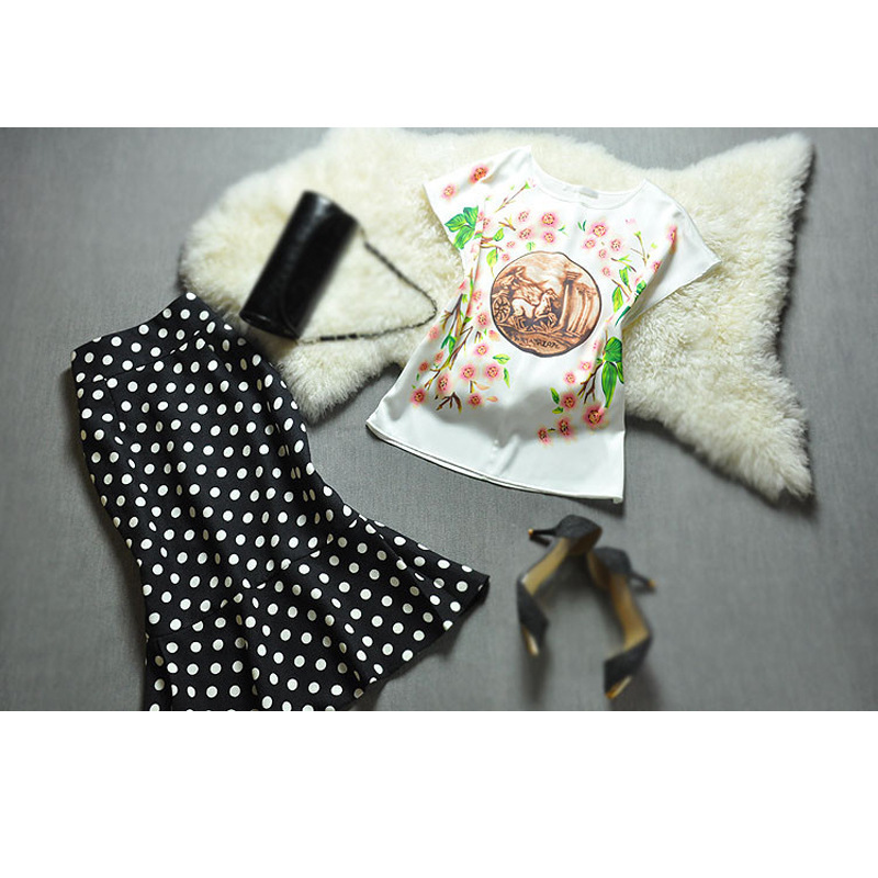 ¥69.00歐洲站2015春新款時尚兩件套蕾絲衫加印花短裙修身套裝6280