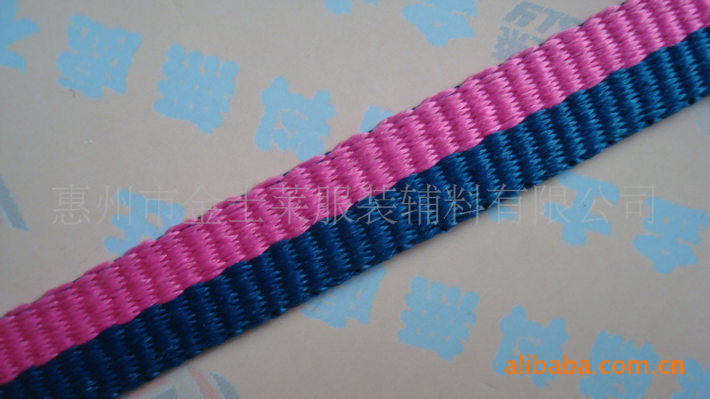 廠家專業生產;各種款式織帶,織繩、384針電腦織字帶、休閑腰帶、印花腰帶、帆布腰帶、織花腰帶、SP線帶、棉腰帶、腰帶、織帶、織繩、印嘜、吊牌、休閑腰帶,床邊帶、可由客人要求定做。材料有滌綸、poly 紗、PP紗、丙綸、高強絲、SP紗、純棉、絲光棉、尼龍、高彈絲、有光絲、全部為環保材料,出口產品,本公司自備染色車間、織帶車間、車縫車間、您如果對我們的服裝輔料、織帶、織繩、腰帶、有不明可來電話咨詢, 我們會竭誠為您服務。服務電話; 惠州市金士萊服裝輔料有限公司
