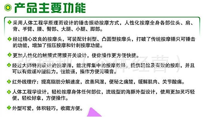 詳細介紹:本產品外形設計為大型按[mo]器,力度更大,按[mo]部位更多,可充分按[mo]頸椎、肩膀等部位;另配8個按[mo]頭,腰部及腿部等部位進行重點按[mo] 。