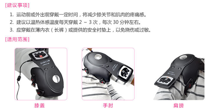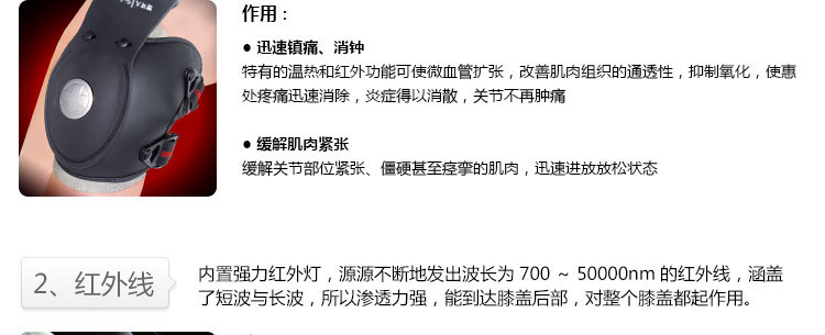 采用了溫熱導子膝蓋四周環繞設計,保證膝蓋周圍穴位都有熱傳導,同時采用了鋁作為傳熱載體,迅速將熱能傳至膝蓋內部。溫控設計,溫度可以45℃-65℃度自由設定。采用的紅外光波長從700-50000nm,涵蓋短波和長波,加速組織細胞活力與再生能力,降低神經末梢的興奮性,松弛肌肉。