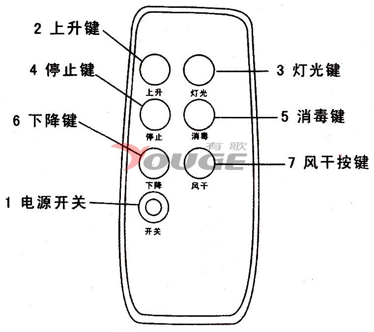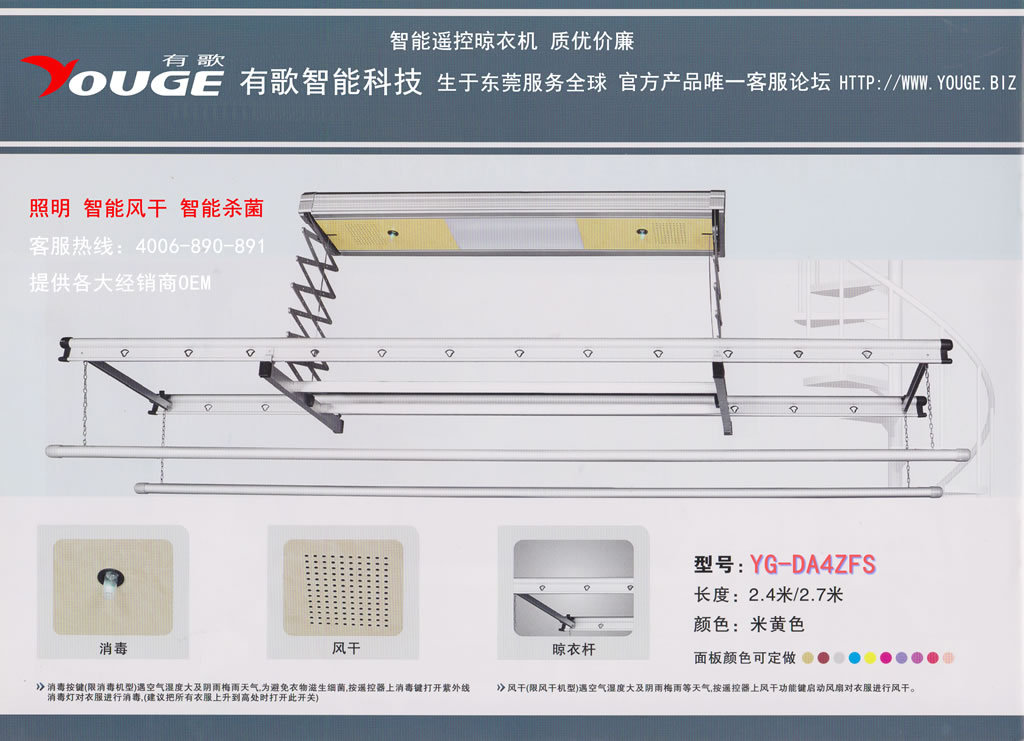 如:YG-DB4ZFS,YG-表示有歌,D-表示電動(dòng)晾衣架,B-代表版本(現(xiàn)在經(jīng)過(guò)升級(jí),順利由A版本變更到B版本),4-代表?xiàng)U數(shù)量,Z-表示具備照明功能(本公司全系列電動(dòng)晾衣架均具備照明功能),F(xiàn)-表示具備風(fēng)干功能,S-表示具備紫外線殺菌功能。