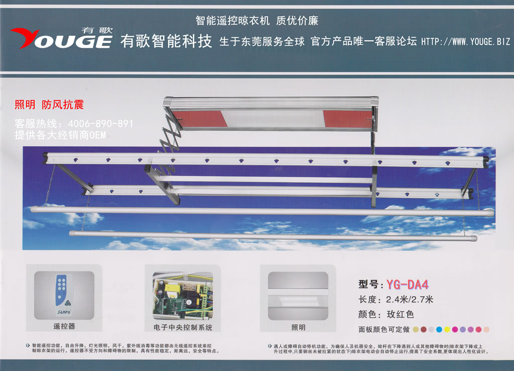 感謝您選擇了有歌的產(chǎn)品,本公司立足于“東莞制造”響亮品牌名都——廣東省東莞市。有歌公司掌握智能遙控電動(dòng)晾衣架核心技術(shù),依托成熟的產(chǎn)業(yè)鏈,成功研發(fā)出多功能的晾衣架,我們相信科技能改變生活,給您帶來(lái)更多便捷,增添無(wú)限舒適享受。生活是一種態(tài)度,成功的彼岸是留給有態(tài)度的您,而有歌是做有態(tài)度的智能產(chǎn)品。