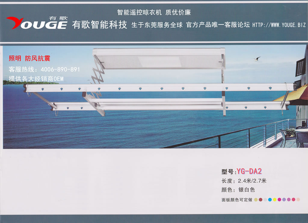 >2012年12月,我們緊接著對(duì)客人顏色的需求重新進(jìn)行高溫烤漆,推出了繽紛系列電動(dòng)晾衣架(型號(hào):YG-DB2ZFS),歡迎客戶選擇,多款,如下圖: