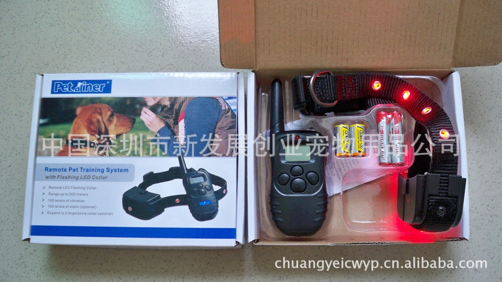 4.接收器帶省電功能,可以發出聲音和有閃燈功能,項圈帶子也會發光,有尋狗器功能.