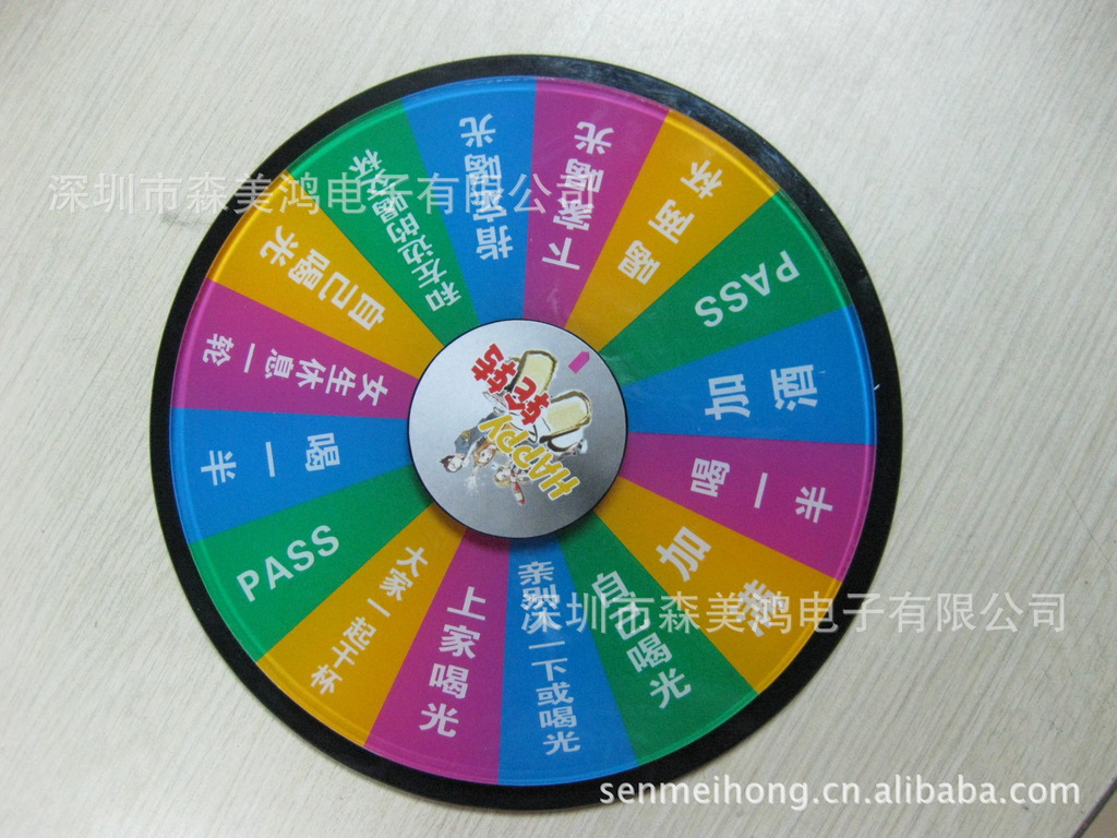 底盤上有指示箭頭,當您轉動上面印有酒令內容的圓盤停下后,停靠在指示箭頭區域的,您就該按指示完成指令。新奇有趣,是喝酒朋友的,酒水行業促銷禮品的。
