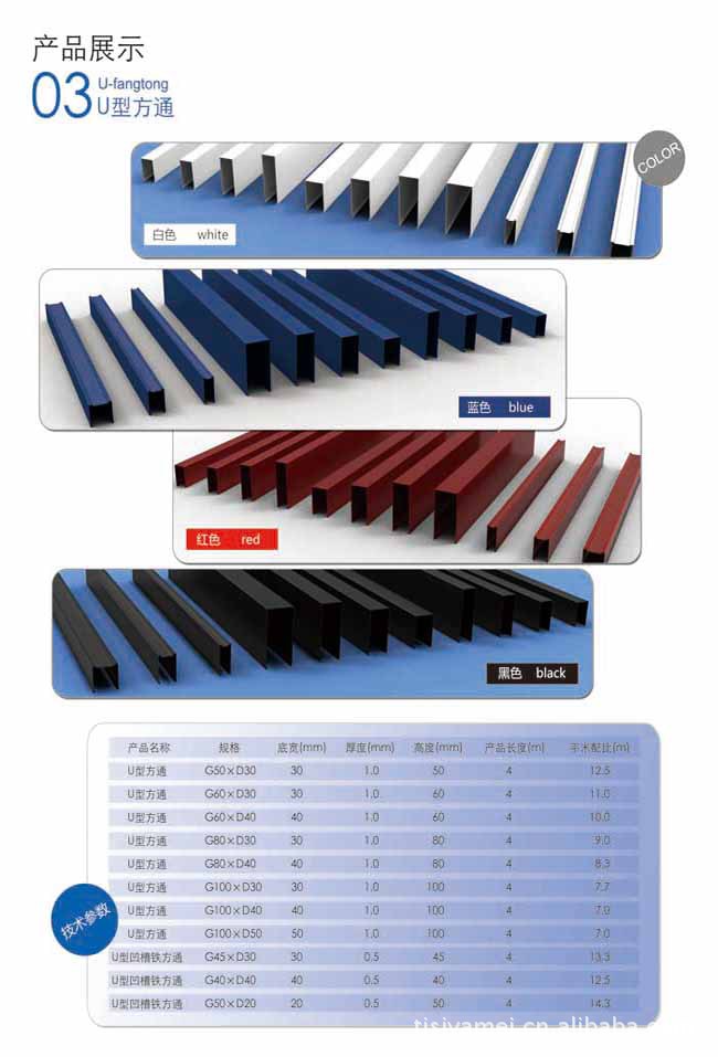 U型方通是公共場所廣泛應用的高檔吊頂材料,采用U型方通吊頂更為體現它的莊重與豪華,尤其是在大型的飛機場,火車站,客運站,百貨商廈,購物廣場,電器城,賓館等裝飾吊頂中體現的更為淋漓盡致,展現了它的魅力所在。