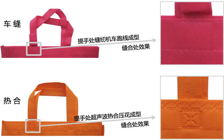 【熱合】以超聲波熱壓成型,承重約3KG左右。優點是美觀,缺點是拎袋時手臂幅度過大,拎手處容易斷。