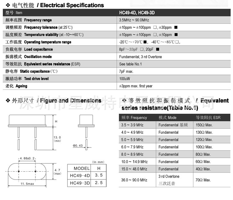 HC49-D系列石英晶體諧振器參數表