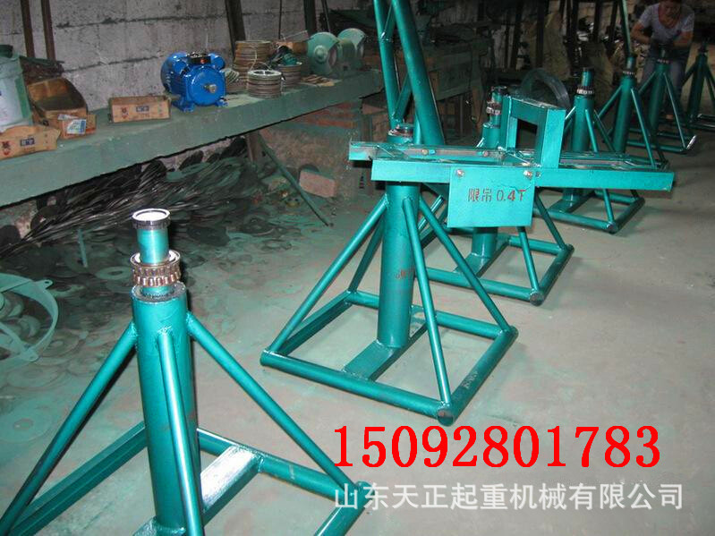 2、支架部分由螺桿,千斤螺母及立桿構(gòu)成的主桿和轉(zhuǎn)動臂組成。轉(zhuǎn)動臂可在主桿上轉(zhuǎn)動360度,在臂端設(shè)有行程開關(guān)以防操作失誤或按鈕失靈而造成的起吊過位事故。操作按鈕起動器實(shí)現(xiàn)電機(jī)正反轉(zhuǎn)可將鋼絲繩卷繞、放開,并通過支架部分滑輪起吊,下放物件來完成吊運(yùn)作業(yè)。