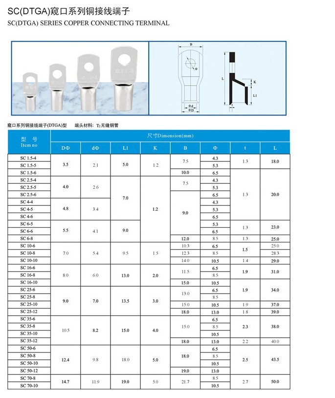 SC鍍錫窺口銅接線端子就是在原來(lái)SC窺口銅接線端子的基礎(chǔ)上,在表層鍍上一層"錫",增強(qiáng)SC窺口銅接線端子的導(dǎo)電能力,防氧化。 SC鍍錫窺口銅接線端子用于銅芯電纜與電氣設(shè)備的銅端連接 小起訂: 1000只