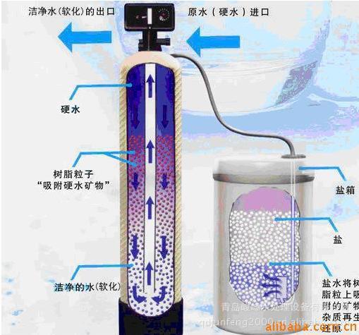水的硬度主要有其中的陽離子:鈣(Ca)、鎂(Mg)離子構成。當含有硬度的原水通過交換器的樹脂層時,水中的鈣、鎂離子被樹脂吸附,同時釋放出鈉離子。這樣從交換器內流出的水就是去掉了硬度離子的軟化水,當吸附鈣、鎂離子的樹脂達到一定程度后,出水硬度增大,此時軟水器按照預定的程序自動進行失效樹脂的再生工作,利用較高濃度的氯化鈉溶液通過樹脂,使失效的樹脂重新恢復至鈉型樹脂。