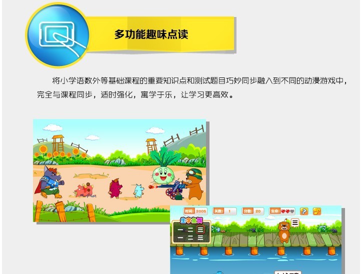 將小學(xué)語(yǔ)數(shù)外生字、單詞等知識(shí)點(diǎn)和測(cè)試題目巧妙融入到不同的動(dòng)漫游戲中,讓學(xué)習(xí)趣味更高效。