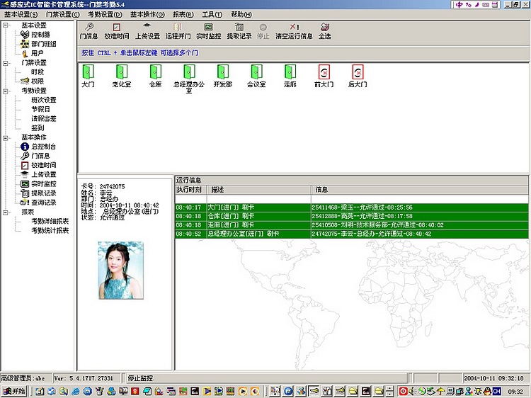 6、實時監控照片顯示門狀態顯示:可以實時監控所有門刷卡情況和進出情況,可以實時顯示刷卡人預先存儲在電腦里的照片,以便保安人員和本人核對。如果接上了門磁信號線,用戶可以一目了然看到哪些門是開著的,哪些門是關著的。