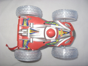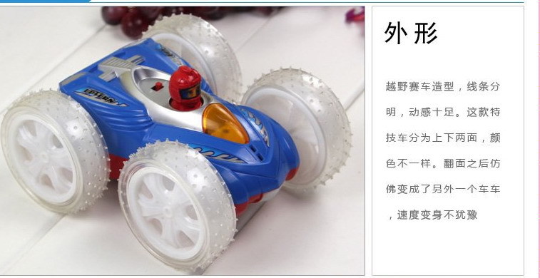 打開開關,把小車放在地上,小車自動向前走,遇到障礙物,小車會翻個跟頭,變成另一面向上,繼續向其他方向走。變成另一面后,車的顏色變成另一個顏色,并且也有一個小人。(注意:有時候電池電量不足,會影響小車翻跟頭)