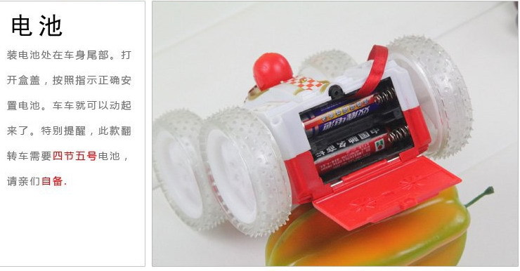 在車子后尾部裝入四節五號電池,打開開關,勁爆的音樂就會響起來,四個透明車輪會交替發出紅藍閃爍的光芒,特制的帶釘車輪,使其摩擦力增大,遇到障礙車身會自動垂直翻身,車子上的人頭在翻過去后就變為另一種顏色的人頭、反面的車身也是另一中顏色、本車很牢固哦!既是一款不錯的特技車,又是一款白輪雙面車哦。