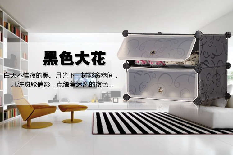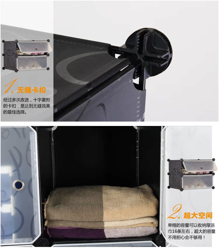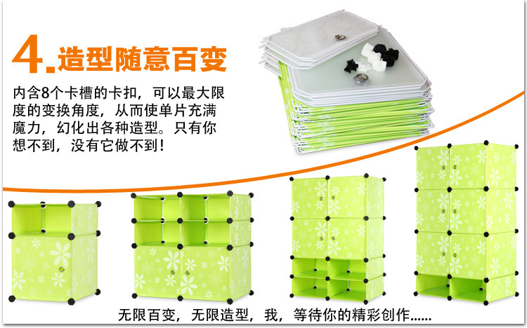 3.四個方向八條鎖槽的卡扣設計,可讓您盡情的發(fā)揮創(chuàng)意,組裝出各種高度,風格,造型的家居收納組合,以滿足不同裝修或實用需要的家庭。