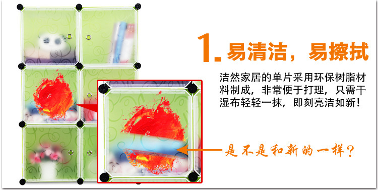 1.該款產品采用的是輕便環(huán)保的PP材料,防潮,耐污,拆卸自由,組裝簡單,清潔便利(溫水抹布一擦即可,如果是頑固污漬可以適當使用一些如洗潔精類的清潔劑擦拭)。
