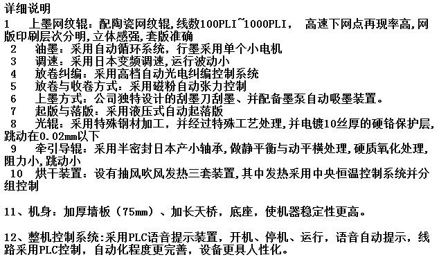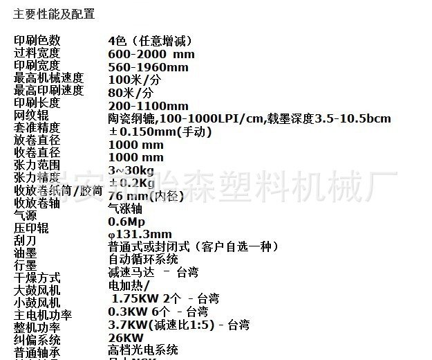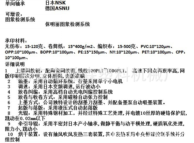 用途: 該機適合印刷聚乙烯、聚丙烯塑料袋、玻璃紙、卷筒紙,無紡布等包裝材料,是食品包裝,超市手提袋、馬夾袋、服裝袋,無紡布袋等包裝的理想印刷設備。 性能和特點: 1、操作簡便,起動柔和,套色準確。 2、計米器可根據(jù)要求設定印刷數(shù)量,到數(shù)自動停機,斷料自動停機。 3、手動起落印版滾筒,升降后油墨自動攪拌。 4、網(wǎng)紋滾筒傳墨,墨色均勻。 5、可靠的干燥系統(tǒng),配合高速運轉(zhuǎn),停機自動斷路。 6、360度連續(xù)可調(diào)的縱向?qū)ㄑb置。 7、進口變頻電機調(diào)速,適應不同印刷速度。 8、版輥座上及收料架上均裝有點動及停止按鈕,便于裝版時操縱機器