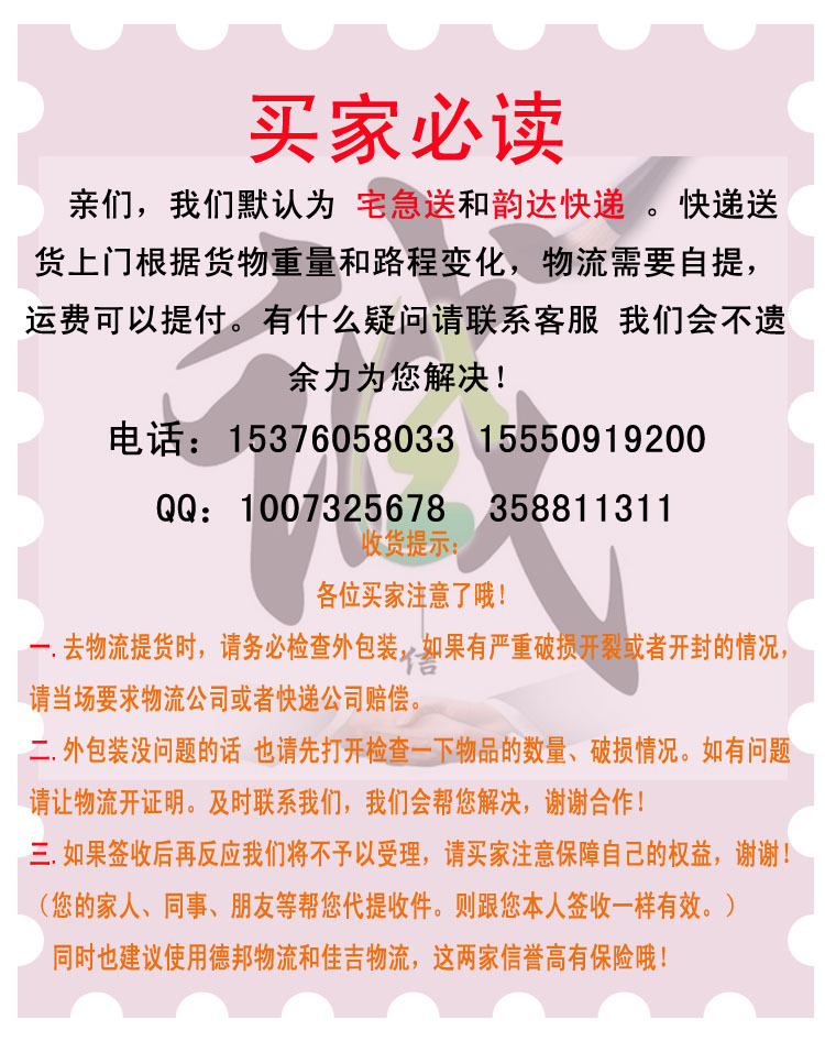 各位買家注意了!在去物流提貨時,請先打開檢查一下物品的數量、破損情況。如有問題請讓物流開證明。及時聯系我們,我們會幫您解決,謝謝合作!(您的家人、同事、朋友等幫您代提收件。則跟您本人簽收一樣有效。物流提貨后就代表確認貨物正確完好,數量正確,之后發生的問題我將不承擔責任。如不放心請自己簽收!)