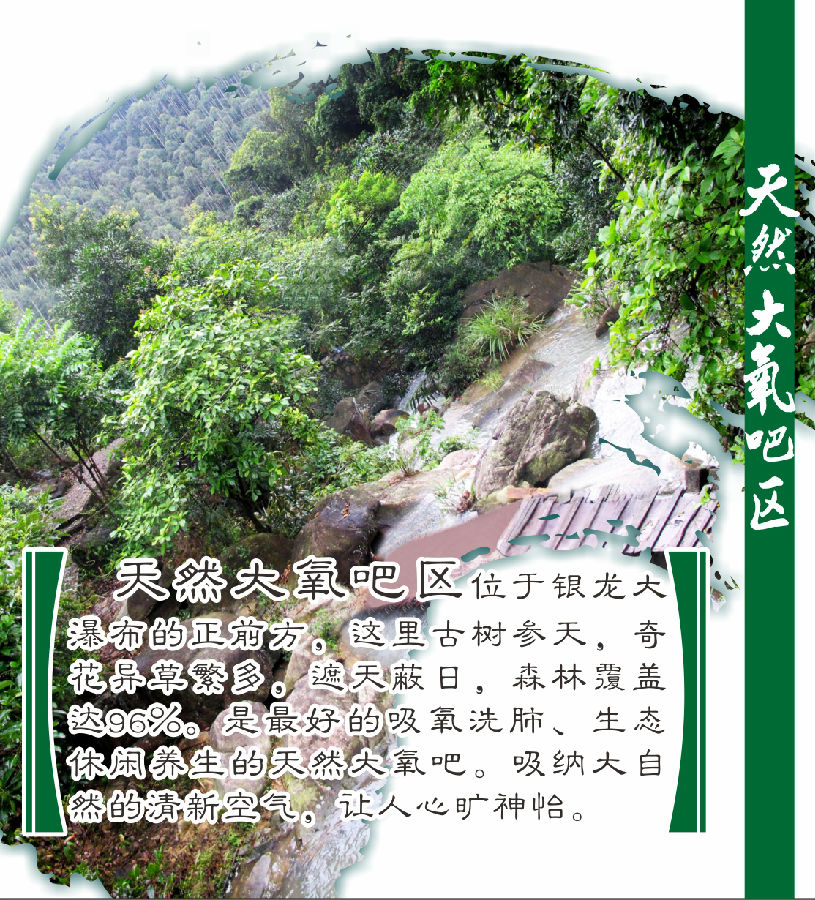 景區(qū)主要的景點有:省內(nèi)蔚為壯觀的銀龍大瀑布、集吃、喝、玩、樂于一體的神仙島公園;大森林***氧吧區(qū);奇石遍布、河水清澈的十里奇石河;穿越深山密林的休閑養(yǎng)生木棧道、古樸風(fēng)情水車群和***泳場等。