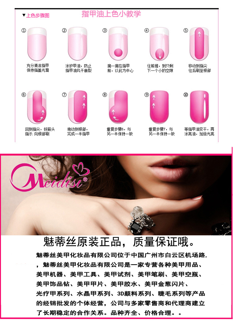 魅蒂絲美甲化妝品有限公司位于中國(guó)廣州市白云區(qū)機(jī)場(chǎng)路,魅蒂絲美甲化妝品有限公司是一家專營(yíng)各種美甲用品、美甲機(jī)器、美甲工具、美甲試劑、美甲筆刷、美甲空瓶、美甲飾品鉆、美甲甲片、美甲膠水、美甲金蔥閃片、光療甲系列、水晶甲系列、3D顏料系列、睫毛系列等產(chǎn)品的經(jīng)銷批發(fā)的個(gè)體經(jīng)營(yíng)。魅蒂絲美甲化妝品有限公司的產(chǎn)品在消費(fèi)者當(dāng)中享有較高的地位,公司與多家零售商和代理商建立了長(zhǎng)期穩(wěn)定的合作關(guān)系。品種齊全、價(jià)格合理。魅蒂絲美甲化妝品有限公司實(shí)力雄厚,重信用、守合同、保證產(chǎn)品質(zhì)量,以多品種經(jīng)營(yíng)特色和薄利多銷的原則,贏得了廣大客戶的信任。