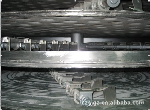 【原 理】 濕物料自加料器連續地加到干燥器上部層干燥盤上,帶有耙葉的耙臂作回轉運動,使耙臂連續地翻抄物料。物料沿指數螺旋線流過干燥盤表面,在小干燥盤上的物料被移送到外緣,在大干盤上的物料向里移動并從中間落料口落入下一層小干燥盤中。大小干燥盤上下交替排列,物料得以連續地流過整個干燥器。中空的干燥盤內通入加熱介質,加熱介質形式有飽和蒸汽、熱水和導熱油,加熱介質由干燥盤的一端進入,從另一端導出。已干物料從后一層干燥盤落到殼體的底層,后被耙葉移送到出料口排出。濕汽從物料逸出,由設在頂蓋上的排濕口排出,真空型盤式干燥器的濕汽由設在頂蓋上的真空泵口抽出。從底層排出的干物料可直接包裝。通過配加翅片加熱器、溶劑回收冷凝器、袋式除塵器、干料返混機構、引風機等輔機,可提高其干燥的生產能力,干燥膏糊狀和熱敏性物料,可方便地回收溶劑,并能進行熱解和反應操作。