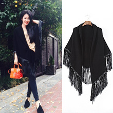2015歐洲站秋裝新款左岸瀟同款黑白格紋流蘇斗蓬披肩外套針織開衫85.00