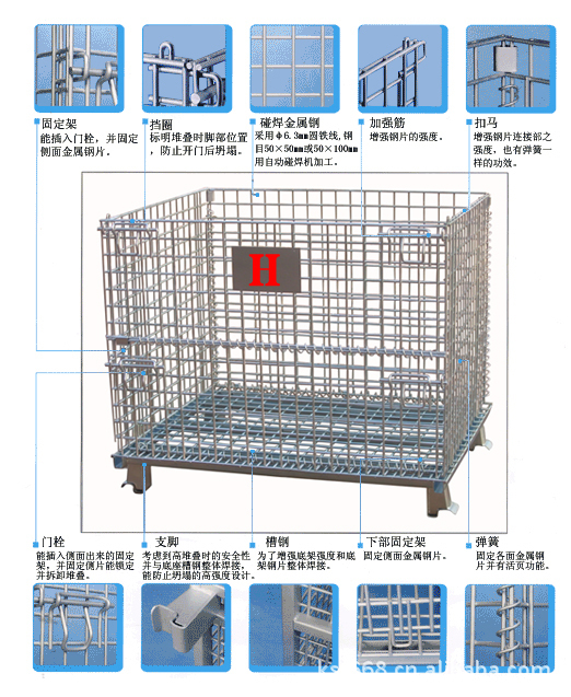 倉儲籠的主要原材料是高線拉成的強力鋼絲,一般絲徑是 5mm, 6mm, 6.4mm。網片焊接的網目間距一般為50×100,100×100,50×50。倉儲籠底部采用U型鋼焊接而成,U型鋼是冷軋帶鋼軋機軋制而成,底部四角采用沖壓件一次沖制而成。