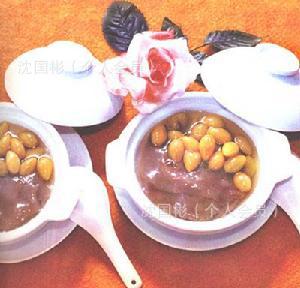 銀杏仁(去殼后用沸水燙去內種皮)6-10粒,冰糖少量,粳米2兩,水適量,同時放入鍋中,文火煮熟即成。以粳米成糊糜狀即可。
