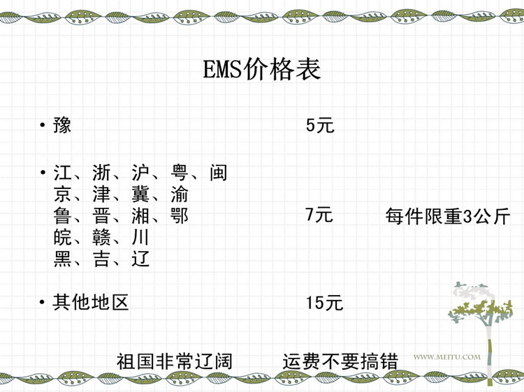發貨本公司快遞默認為天天和國通。如需指定快遞,請在備注留言說明,不說明的一律發天天和國通,其不到的地方 ,請備注說明發EMS。貨多可以用物流,全國無盲區。