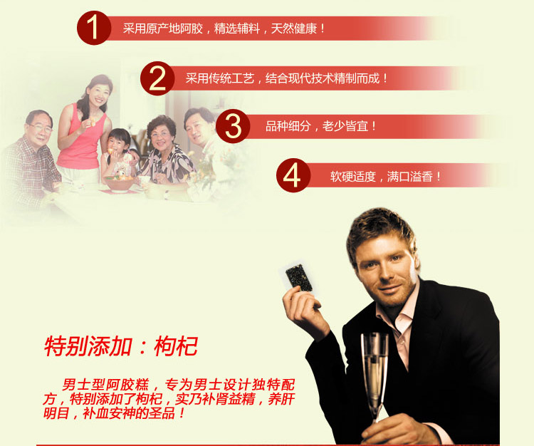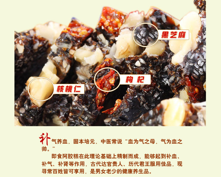 產品介紹:***地道山東阿膠,輔以黑芝麻、核桃仁、紅棗、桂圓、冰糖、黃酒等名貴中