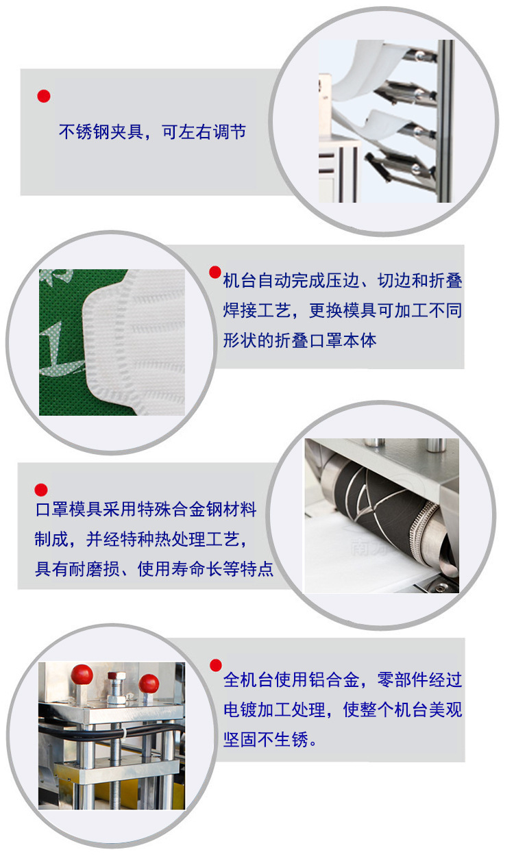 3、操作時不需預(yù)熱可連續(xù)性加工、速度快、可大量生產(chǎn)折疊口罩;