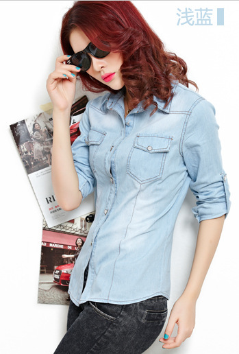 2015春裝新款女裝歐美日韓修身收腰薄款打底牛仔襯衫廠家***款
