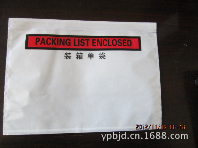 背膠袋廣泛用于裝運箱單、提貨單、安全數據單等。專業生產不同型號,尺寸和顏色的背膠袋。背膠袋可根據客戶要求定制和印刷,印刷色可達到5種。背膠袋背后涂膠幾乎可以粘在任何表面上,防灰塵和水分。背膠袋易于使用,密封PE袋可保護單據在運輸中的安全。標準生產尺寸如圖樣:(可根據客戶要求定制尺寸、樣式和顏色)我公司專業生產背膠袋(也叫不干膠塑料、貼箱袋裝箱單信封),一面有不干膠可以貼于紙箱或木箱等包裝容器上,另一面透明開口,可放入裝箱單.提貨單.安全數據單等隨貨資料,。易于行業。區別及清點包裝物品.密封PE袋可以保護單據在運輸中的安全,可按客戶要求定做各種規格尺寸