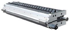 衣架式結構淋膜模頭。在模唇部可得到連續無阻攔的流面,裝有微小間隔的推拉式調節螺釘對樹脂的壓力與金屬的上下反彈起作用,可彎曲柔性模唇以調節模口間隙具有內堵式,外堵式調節裝置調節產品寬度。表面全部鍍硬鉻,緊固件采用12.9級高強度螺栓,采用優質,耐用不銹鋼加熱棒分區控制加熱。生產穩定,結構簡單,便于拆卸,清理。生產0.02mm-0.8mm厚的流延膜,適用產品紙張,無紡布,鍍鋁膜,鋁箔,編織袋等。適用:PP, , PE, TPU, PP, PE, EVA, CPE等原料。模具幅寬300-6000mm 。