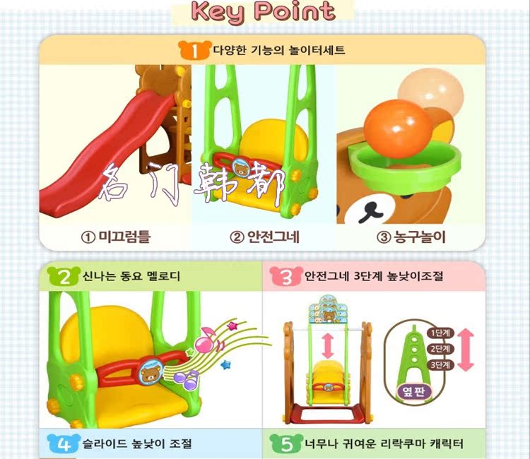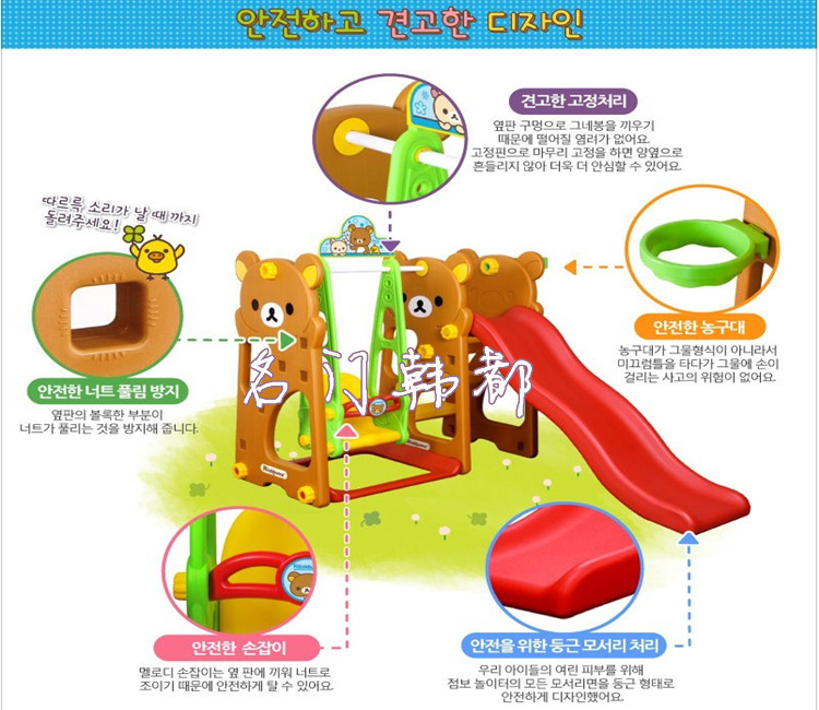 本店2013年隆重推出的一款室內大型兒童玩具,滑梯秋千組合,采用韓國無毒環保材質,韓國原產,為了寶寶的健康請您一定選擇正品,我們店所有商品皆為生活在韓國的店主從韓國發集裝箱到國內,全部現貨,歡迎團購