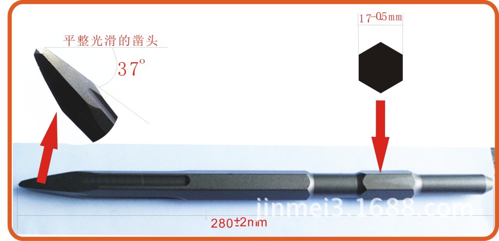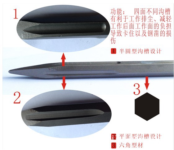 l 普通尖鑿六角材料為六角拉絲型材而新型尖鑿六面拉絲成凹凸槽有便于工作時:排塵,減輕工作的壓力。