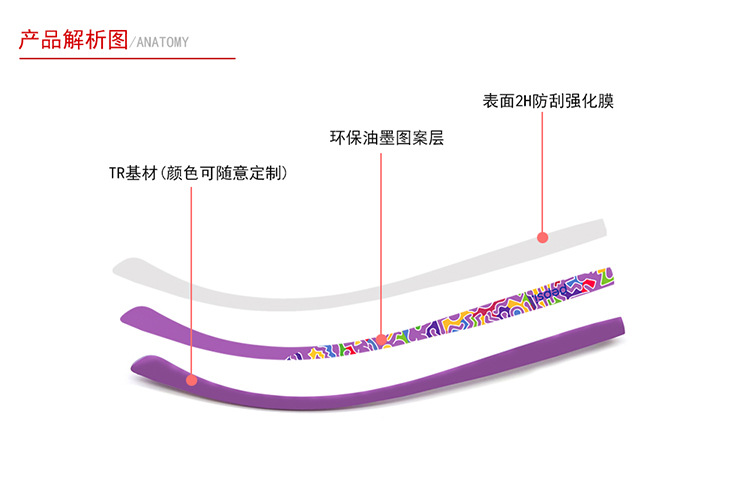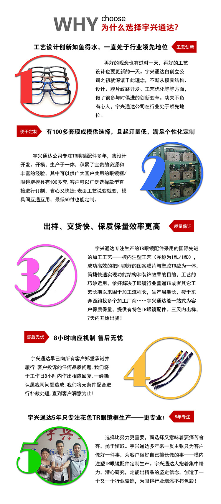 宇興通達眼鏡配件采用先進技術——模內注塑枝術,即將已印刷好的圖案膜片放入塑膠模內注塑,而后緊密貼合,最后實現結構功能及裝飾雙重效果的過程。使得眼鏡框美觀、時尚、高端大氣,同時有抗老化,防輻射等特性,能通過30多項可靠性測試。