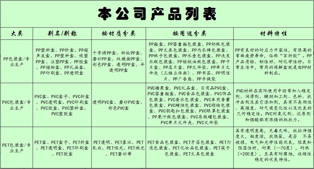 義烏索尼克印刷包裝有限公司主營(yíng)PP、PVC、PET等各類包裝盒,產(chǎn)品覆蓋PP鞋盒、PP襪子盒、PP奶瓶盒、PP文具盒、PP文件夾/袋、PP卡片盒、PP名片夾、PP碟片夾、PP胸卡夾、PP廣告扇、PP明信片、PP書(shū)簽、PVC禮品盒、PVC糖果盒、PVC資料夾/袋、PET包裝盒等等。