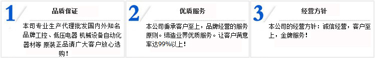 * 主營(yíng):繼電器、斷路器、接觸器、 起動(dòng)器、光纖放大器、接近開關(guān)、光電開關(guān)行程開關(guān)、氣動(dòng)元件、微動(dòng)開關(guān)、編碼器 。代理分銷國(guó)外品牌有施耐德、ABB、西門子、歐姆龍、和泉、圖爾克、奧托尼克斯、富士、三菱、松下、天得、基恩士、神視、施克、圖爾克、巴魯夫易福門、倍加福、皮爾茲、等各種知名品牌低壓電器。 公司秉承“顧客至上,銳意進(jìn)取”的經(jīng)營(yíng)理念,堅(jiān)持“客戶”的原則為廣大客戶提供優(yōu)質(zhì)產(chǎn)品和周到的服務(wù)。歡迎廣大客戶惠顧!