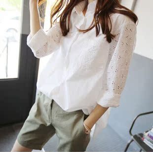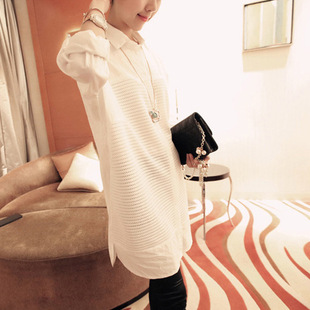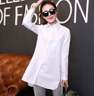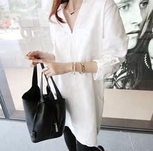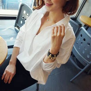 2015春韓國東大門代購寬松bf風中長款V領白襯衫長袖顯瘦女士襯衣銷量4113