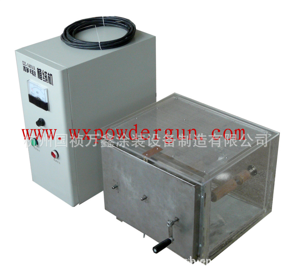 工作原理:靜電植絨機是一個高壓發生器,這項工作的原則是不同的電荷互相吸引。當靜電植絨機工作的時候,它會產生高壓,絨毛會帶上負電荷。將工件的機體置于零電位或者接地,絨毛便會被基體吸附垂直立于機體上。基體在植絨前先刷上膠水,絨毛才會被粘在工件基體上。