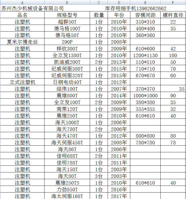蘇州杰少機械設備有限公司長年回收銷售二手注塑機、加工中心、慢走絲、模房設備、機器人、高速沖床,整廠收購,現場免費評估,中介重酬!我公司提供高品質的設備、高水平的服務,滿足客戶需求是我們的經營方針,人品、真誠、創新是我公司的文化精神。