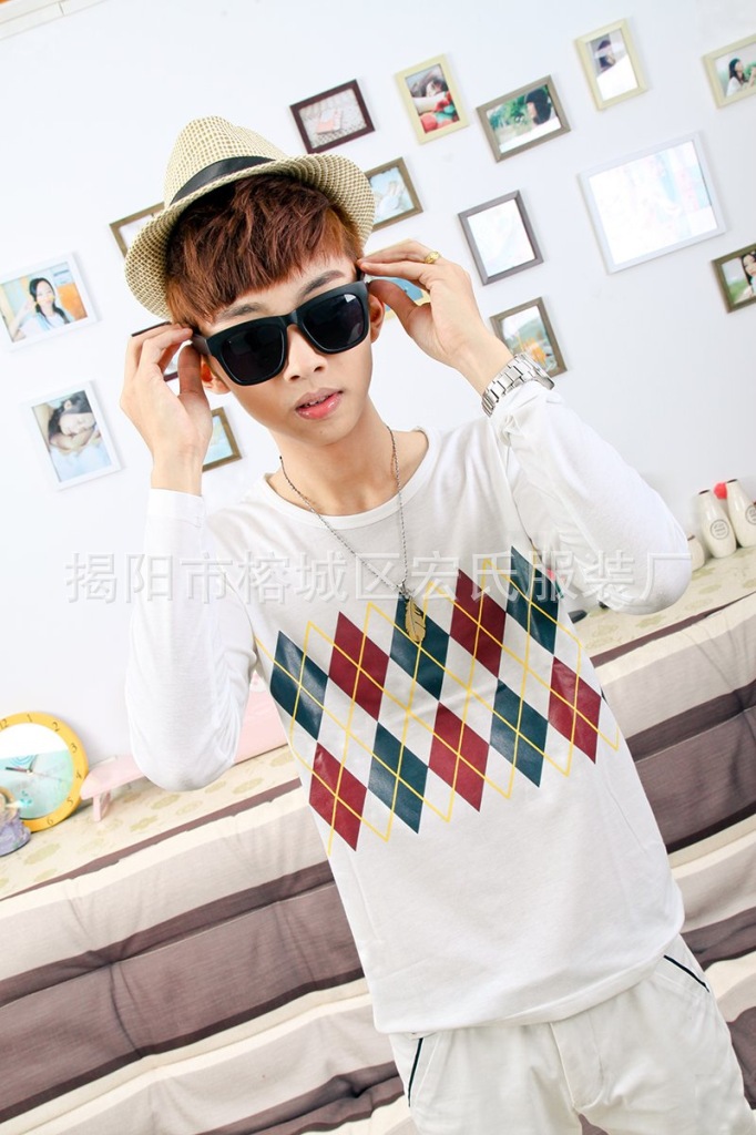 2015林彎彎潮男長(zhǎng)袖秋裝t恤大花小花韓版純棉情侶裝男士t恤菱形