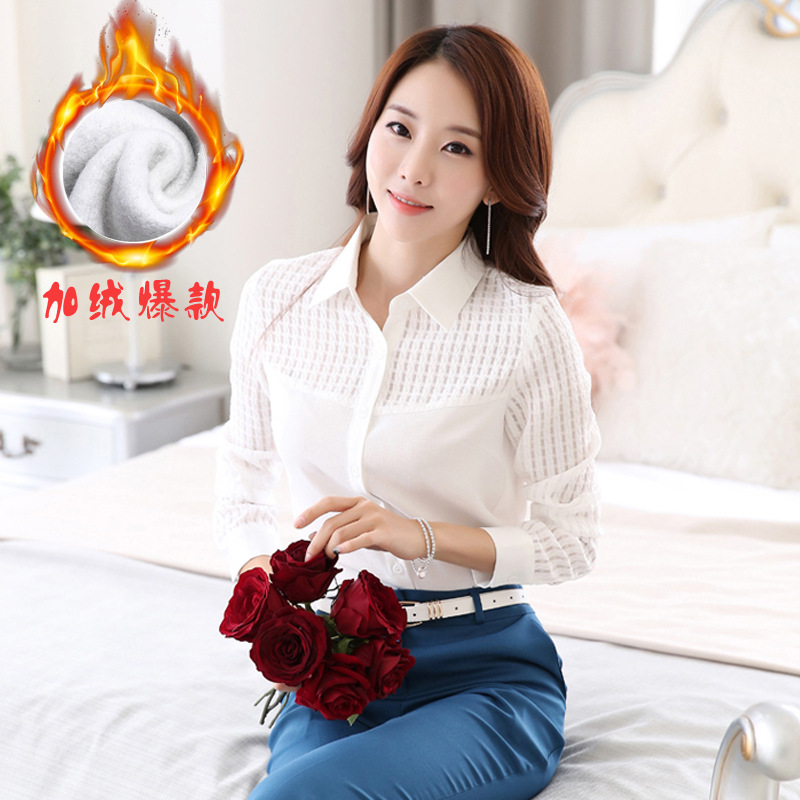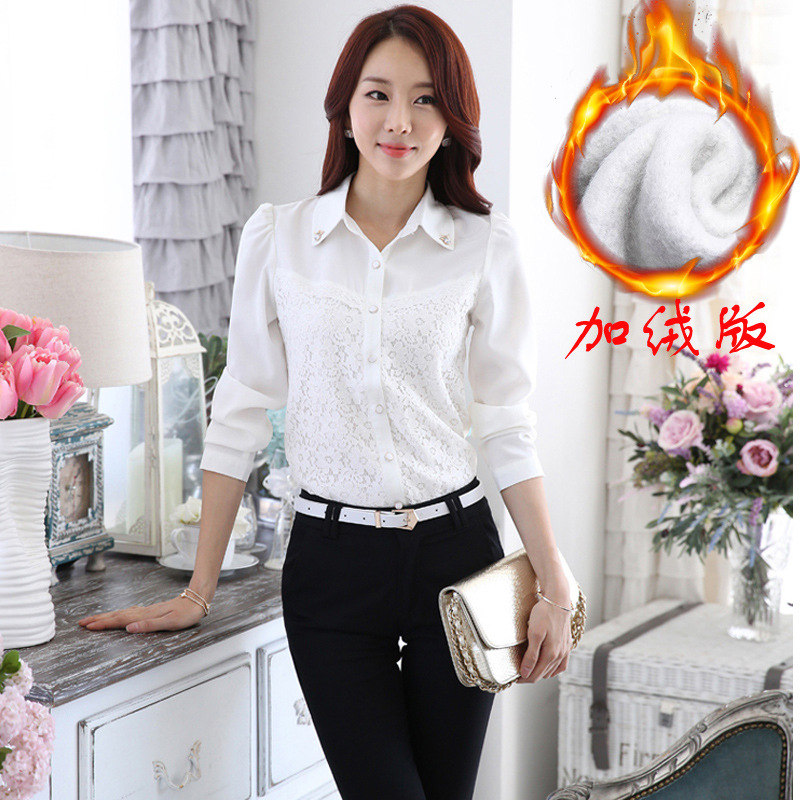 2015秋冬新款韓版女裝保暖長袖襯衫女 蕾絲加絨加厚打底雪紡衫¥59立即搶購