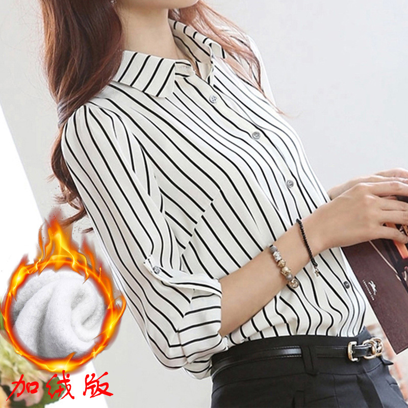 2015尚新廠家直銷加絨長袖黑白條紋蕾絲雪紡襯衫顯瘦保暖長袖襯衣¥49立即搶購