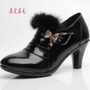 2013新款真皮真毛高跟粗跟中老年休閑舒適單鞋蝴蝶結(jié)媽媽鞋低幫鞋