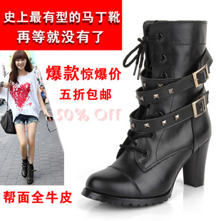 韓版時(shí)尚鉚釘馬丁靴 真皮機(jī)車女靴 高跟中筒靴子 女鞋 溫州廠家